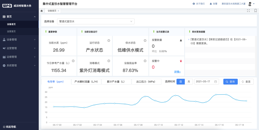 利用互聯(lián)網(wǎng)技術(shù)搭建優(yōu)質(zhì)水管理平臺(tái),為用戶提供全生命周期的運(yùn)維服務(wù)。將設(shè)備的運(yùn)行數(shù)據(jù)和泵房視頻圖像遠(yuǎn)程傳輸?shù)焦竟芾砥脚_(tái),實(shí)現(xiàn)24小時(shí)遠(yuǎn)程監(jiān)控,管理者可以實(shí)現(xiàn)更好的設(shè)備管理和運(yùn)營(yíng)管理,及時(shí)了解設(shè)備運(yùn)營(yíng)情況,保障安全優(yōu)質(zhì)供水。用戶也可通過手機(jī)端隨時(shí)查詢水質(zhì)狀況、濾芯使用壽命等,管理更加高效智能、專業(yè)科學(xué)。