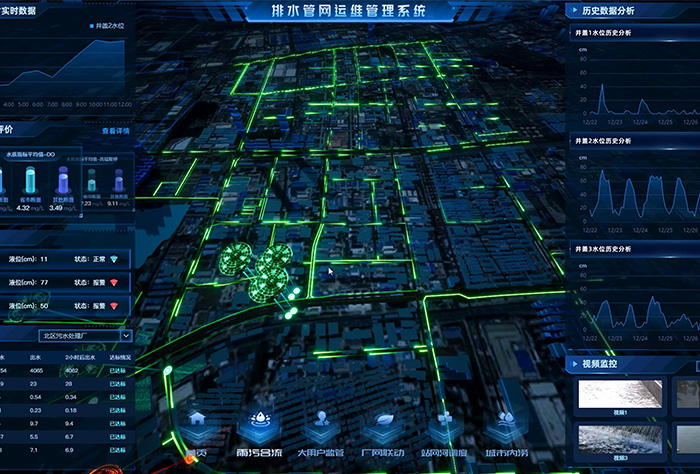 建立二三維可視化管網(wǎng)一張圖,實現(xiàn)實時動態(tài)監(jiān)測,并基于大數(shù)據(jù)技術(shù)分析管網(wǎng)缺陷、評估排水運行狀態(tài),有效提升城市排水系統(tǒng)的監(jiān)管、處理能力,保證城市排水設(shè)施正常運行。