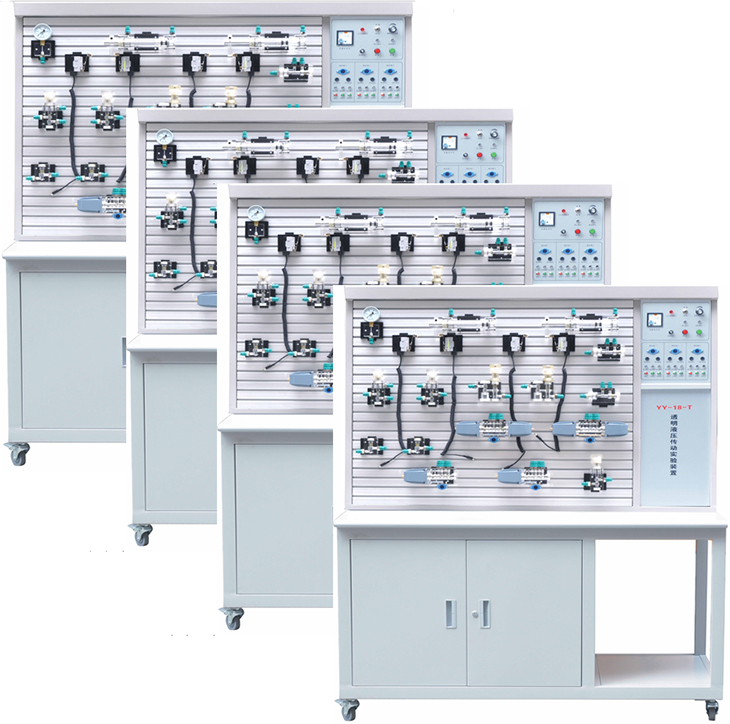 透明液壓實(shí)驗(yàn)臺為實(shí)現(xiàn)液壓傳動課程現(xiàn)代化教學(xué)而進(jìn)行研究的最新科技成果,它填補(bǔ)了技校、中專、大專院校的液壓傳動透明教學(xué)設(shè)備的國家空白。液壓傳動具有重量輕、功率大、結(jié)構(gòu)簡單、布局靈活、控制方便等特點(diǎn)、速度、扭矩、功率均可作無級調(diào)節(jié),能迅速換向和變速,調(diào)速范圍寬,快速性好,工作平穩(wěn)、噪音小,元器件已實(shí)現(xiàn)系列化、標(biāo)準(zhǔn)化,通用化等一系列優(yōu)點(diǎn),隨著科學(xué)技術(shù)的發(fā)展,液壓傳動作為一種可以傳遞動力和控制的傳動方式,已經(jīng)日益廣泛應(yīng)用到醫(yī)療、科技、軍事、工業(yè)自動化生產(chǎn)、起動、運(yùn)輸、礦山、建筑、航空等各個領(lǐng)域。為了適應(yīng)在短暫課堂時間內(nèi),完成多個液壓油路的教學(xué)內(nèi)容。同時對比演示多個不同油路的工作原理。而且,使油路系統(tǒng)的安裝調(diào)試有必要的程序且不占用上課教學(xué)時間。就必須有多臺設(shè)備同時工作。同時,YY-18