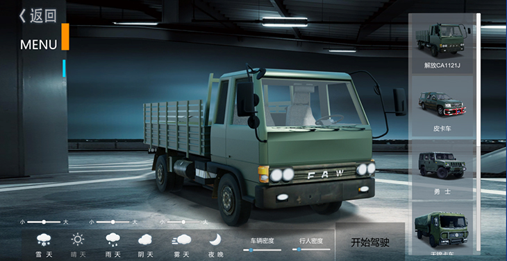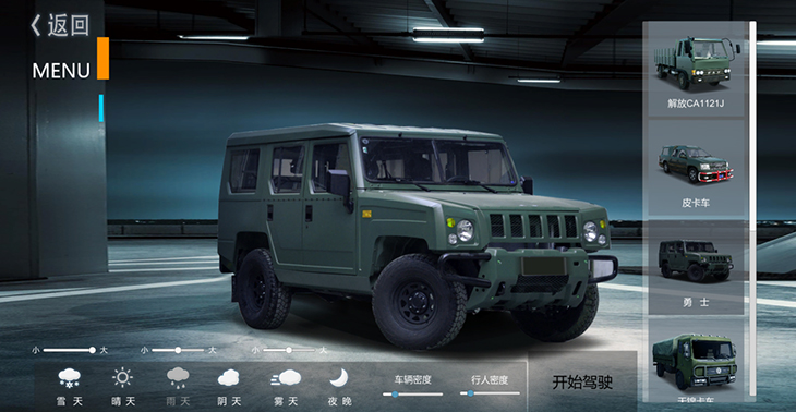 7.1、仿真車模型:10 種典型虛擬車輛模型:東風猛士、北汽勇士、 EQ1118、EQ1121、 EQ2102、SX2150、SX2190、豪濼 ZZ2197、東風天錦、大客車等,并可根據(jù)需要拓展、定制個 性化車輛模型。